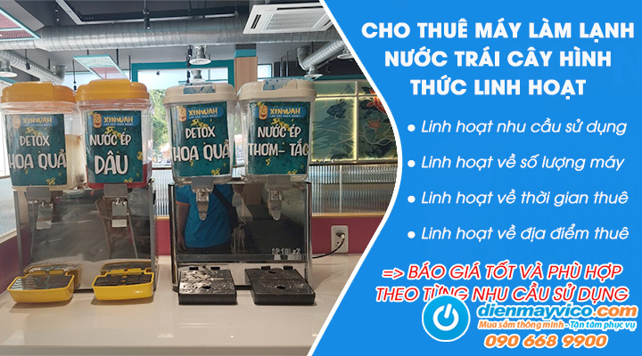 - Hoặc Điện Máy Vi Co còn cho công ty chuyên tổ chức sự kiện cần hợp tác lâu dài. Thuê máy giữ lạnh nước trái cây 2 hộc với giá rẻ và có sự hỗ trợ trọn gói theo đúng yêu cầu đặt ra từ công ty của bạn.