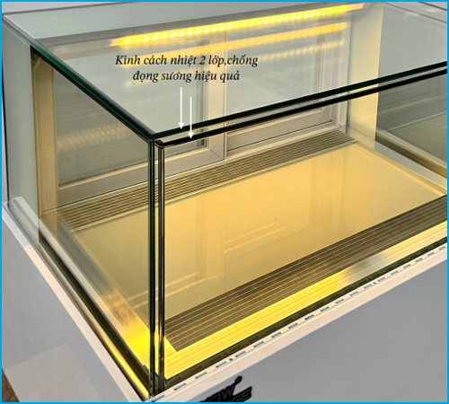 Hệ thống chiếu sáng LED bố trí hợp lý mang đến ánh sáng nhẹ nhàng, tôn lên vẻ hấp dẫn của từng chiếc bánh và làm nổi bật không gian trưng bày. Lớp kính hai lớp trong suốt, chống đọng sương, giúp khách dễ dàng quan sát sản phẩm mà vẫn giữ được hiệu quả cách nhiệt tối ưu.