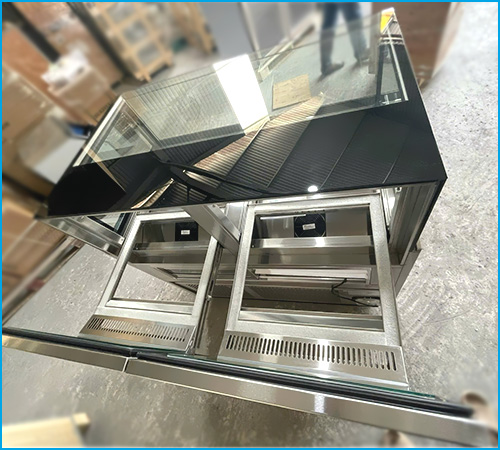 Toàn bộ khung tủ được chế tạo từ inox cao cấp chống gỉ, giúp tăng độ bền và đảm bảo vệ sinh thực phẩm. Phần trưng bày được làm từ kính cường lực trong suốt, mang lại vẻ sang trọng và khả năng chịu lực tốt. Ngoài ra, tủ còn được tích hợp công nghệ hút chân không giúp giảm thiểu tình trạng đọng sương, giữ cho mặt kính luôn sáng trong và tầm nhìn rõ ràng.