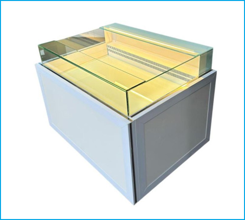 Phần kính trưng bày được chế tạo từ kính siêu trong dày 10mm, có khả năng chống va đập và chịu lực tốt, đảm bảo tầm nhìn rõ ràng từ mọi góc độ. Nhờ độ trong suốt cao, các sản phẩm bên trong luôn được hiển thị tươi mới, hấp dẫn, giúp thu hút sự chú ý của khách hàng trong khu vực trưng bày.