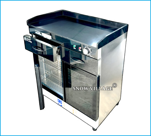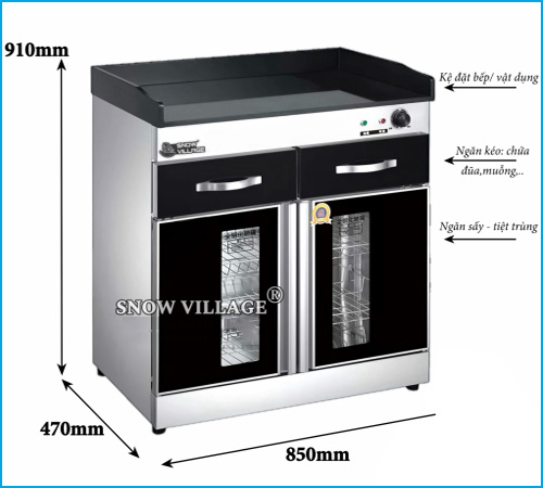 Tủ sấy chén bát Snow Village được thiết kế thông minh với ba khu vực chức năng: mặt bàn trên cùng có thể tận dụng để đặt vật dụng, ngăn kéo giữa dùng lưu trữ đồ nhỏ, và khoang sấy chính phía dưới có cửa kính trong suốt giúp người dùng dễ dàng theo dõi quá trình vận hành. Cấu trúc này giúp tiết kiệm diện tích mà vẫn mang lại sự tiện lợi tối đa trong thao tác.